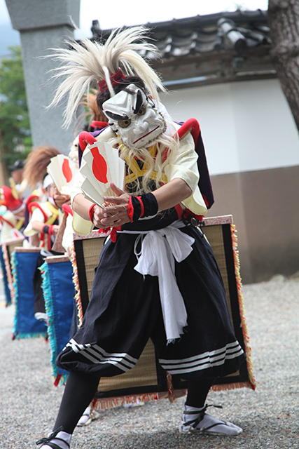 It features masked dancers dancing to a nenbutsu hymn and burning incense, crouching middle section, and then swinging the sword like a stirring Asura in a fierce battle.